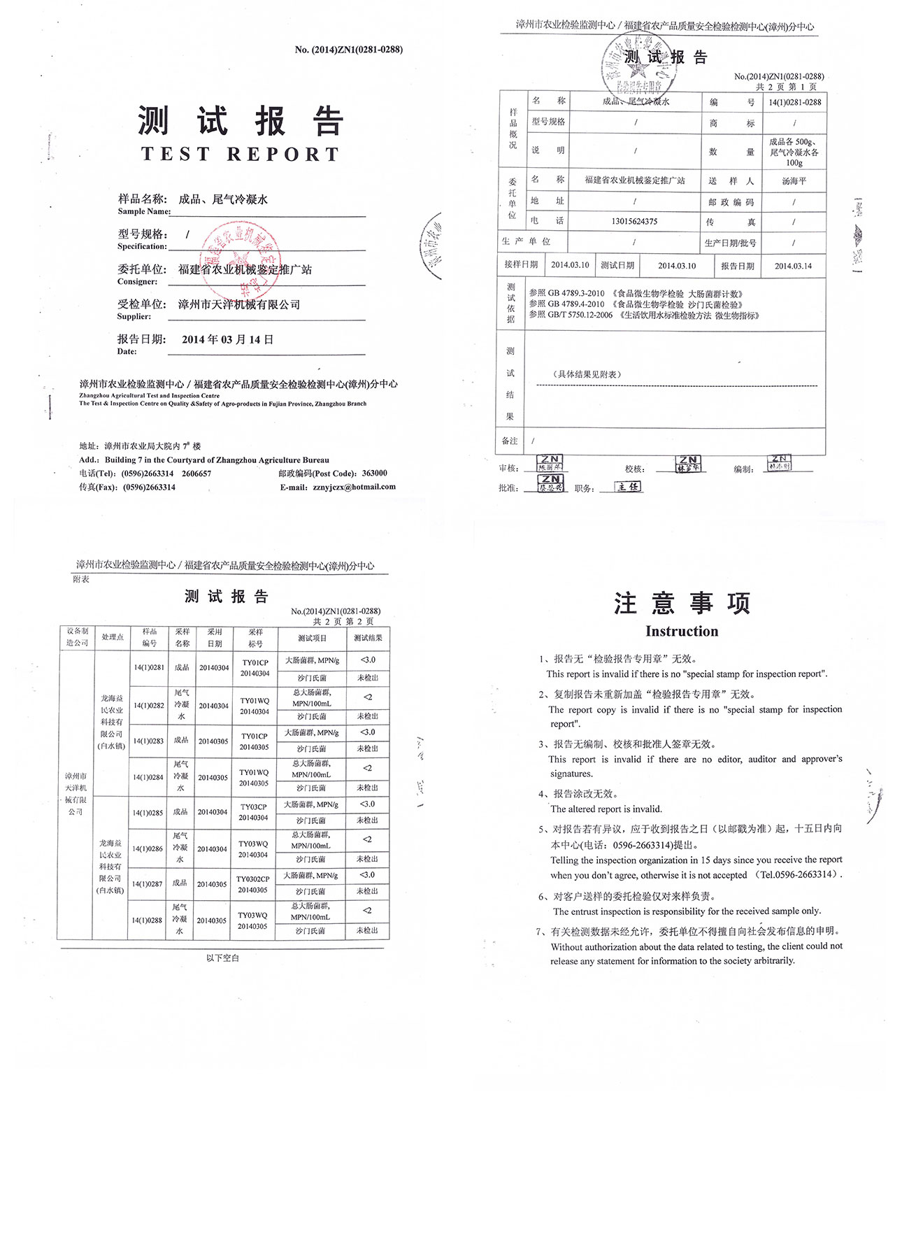 漳州市農(nóng)業(yè)檢驗(yàn)監(jiān)測(cè)中心/福建省農(nóng)產(chǎn)品質(zhì)量安全檢驗(yàn)檢測(cè)中心(漳州)分中心測(cè)試報(bào)告--成品、尾氣冷凝水檢測(cè)