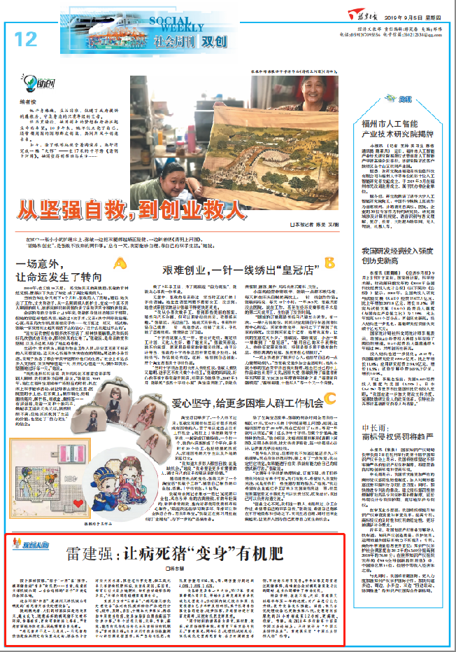 2019年9月5日,福建省委機關報《福建日報》發(fā)布題為“讓病死豬'變身'有機肥”的新聞報道,將我司雷建強總經理主導研發(fā)病死豬無害化設備的創(chuàng)業(yè)故事作為雙創(chuàng)代表的先進事跡進行宣傳報道。具體報道內容如下: